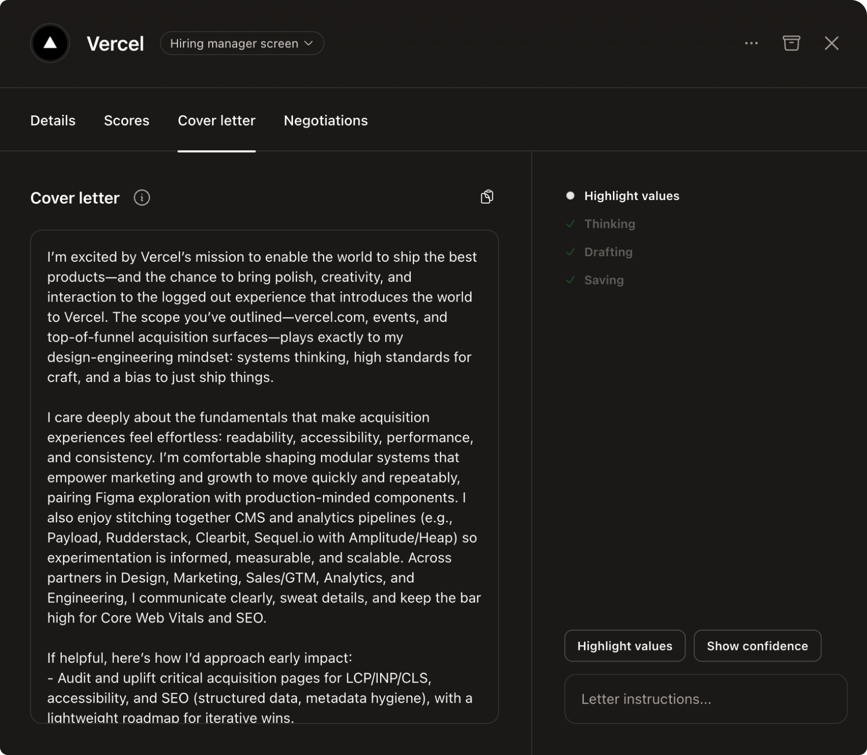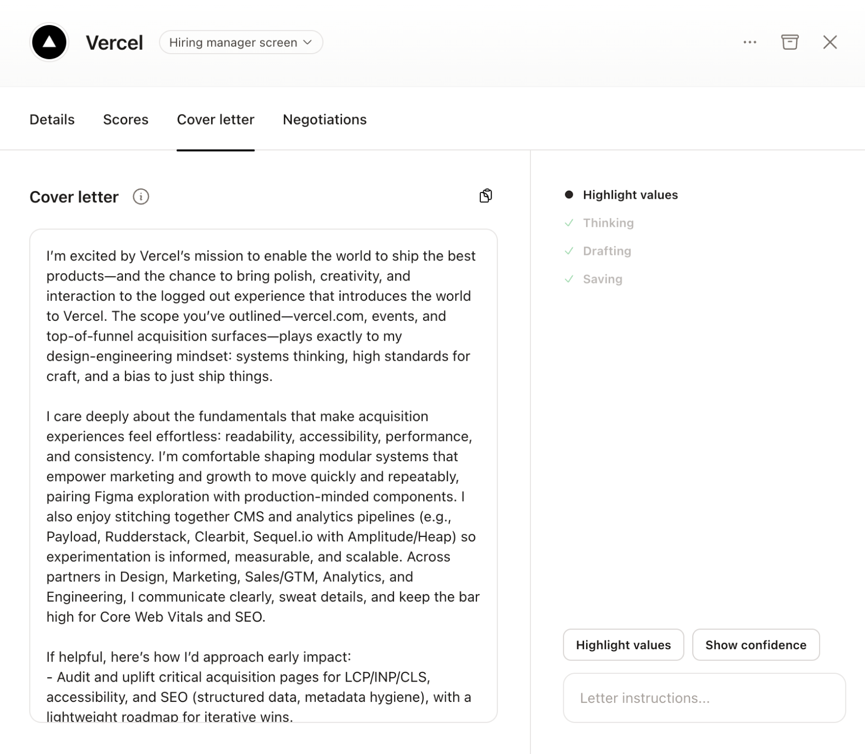 It's exhausting writing similar cover letters over and over. Compin makes it easy by using ChatGPT5 to write expert cover letters that pull in details from the job posting (in case recruiters are using their own AI to screen cover letters), and highlights the values you care about.